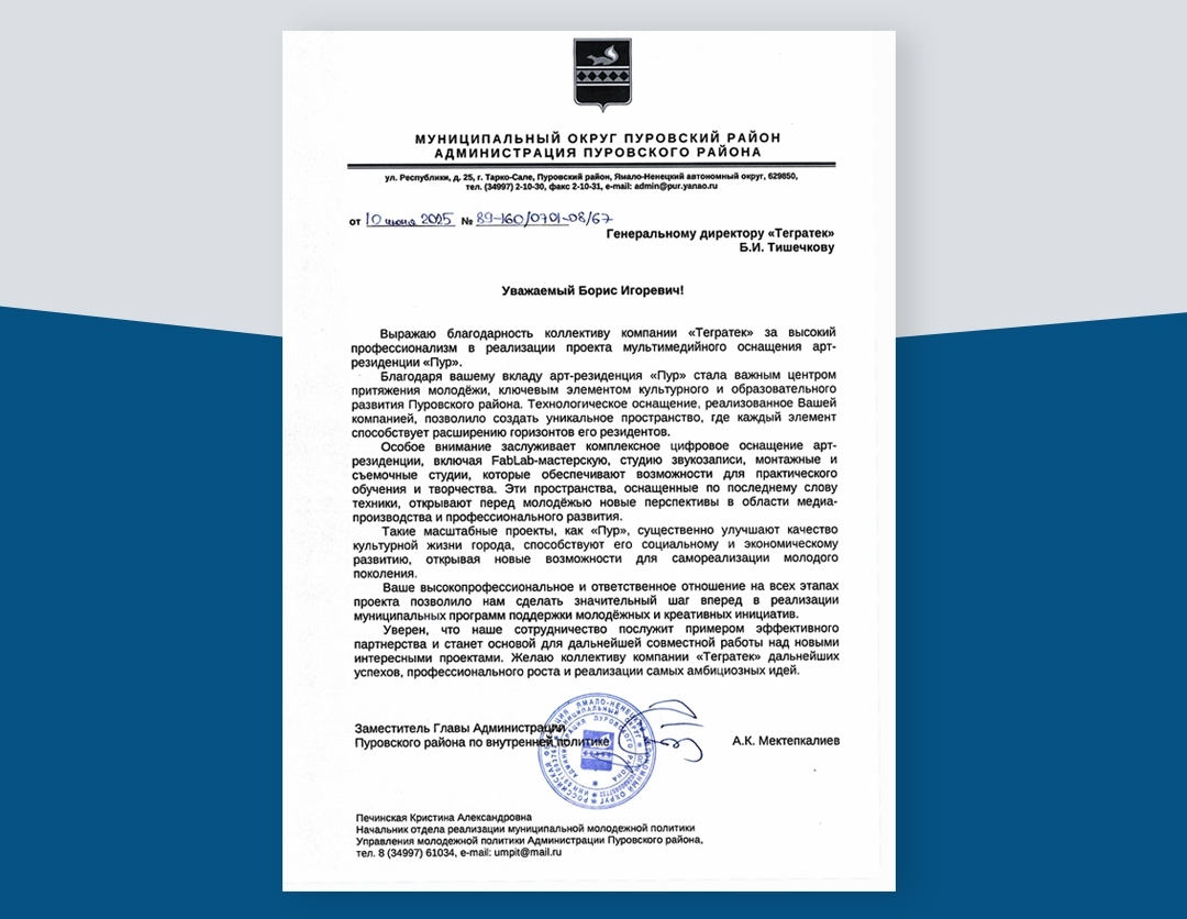 Компания «Тегратек» получила официальное благодарственное письмо от администрации Пуровского района Ямало-Ненецкого автономного округа за реализацию проекта мультимедийного оснащения арт-резиденции «Пур».